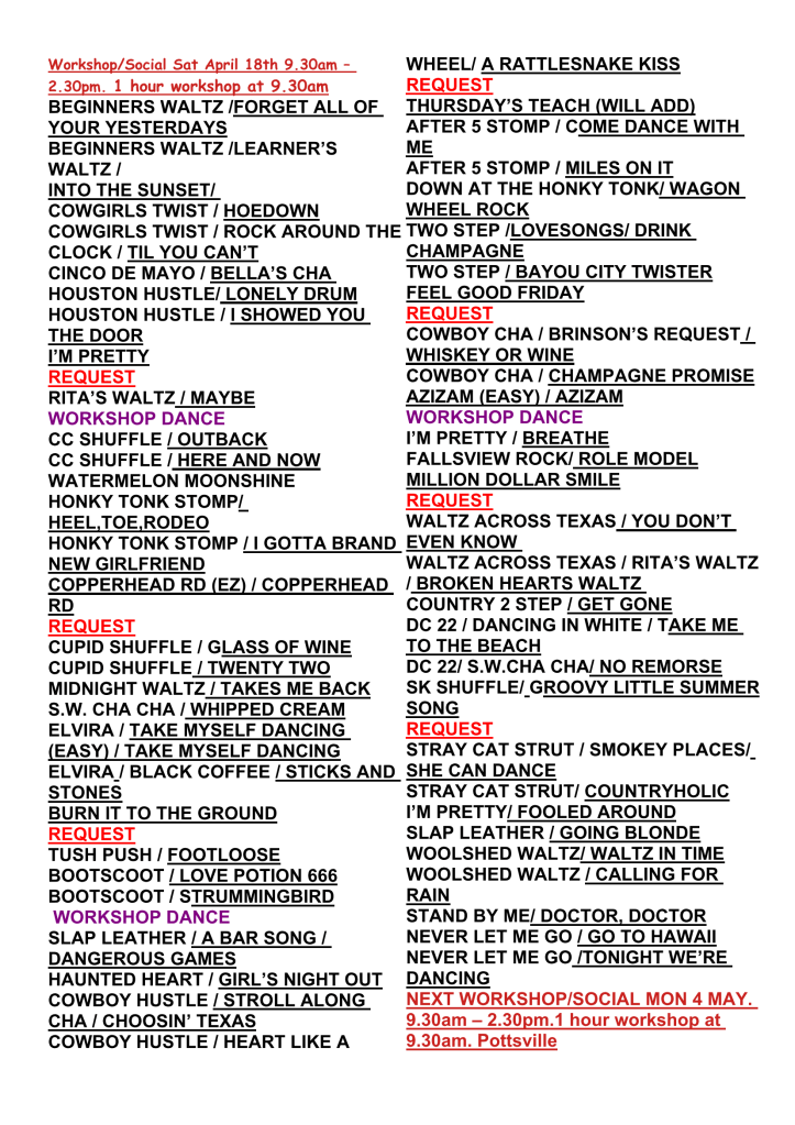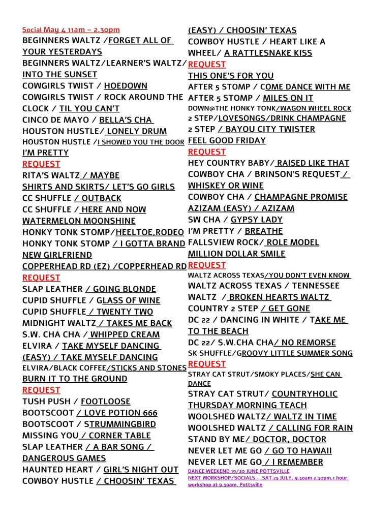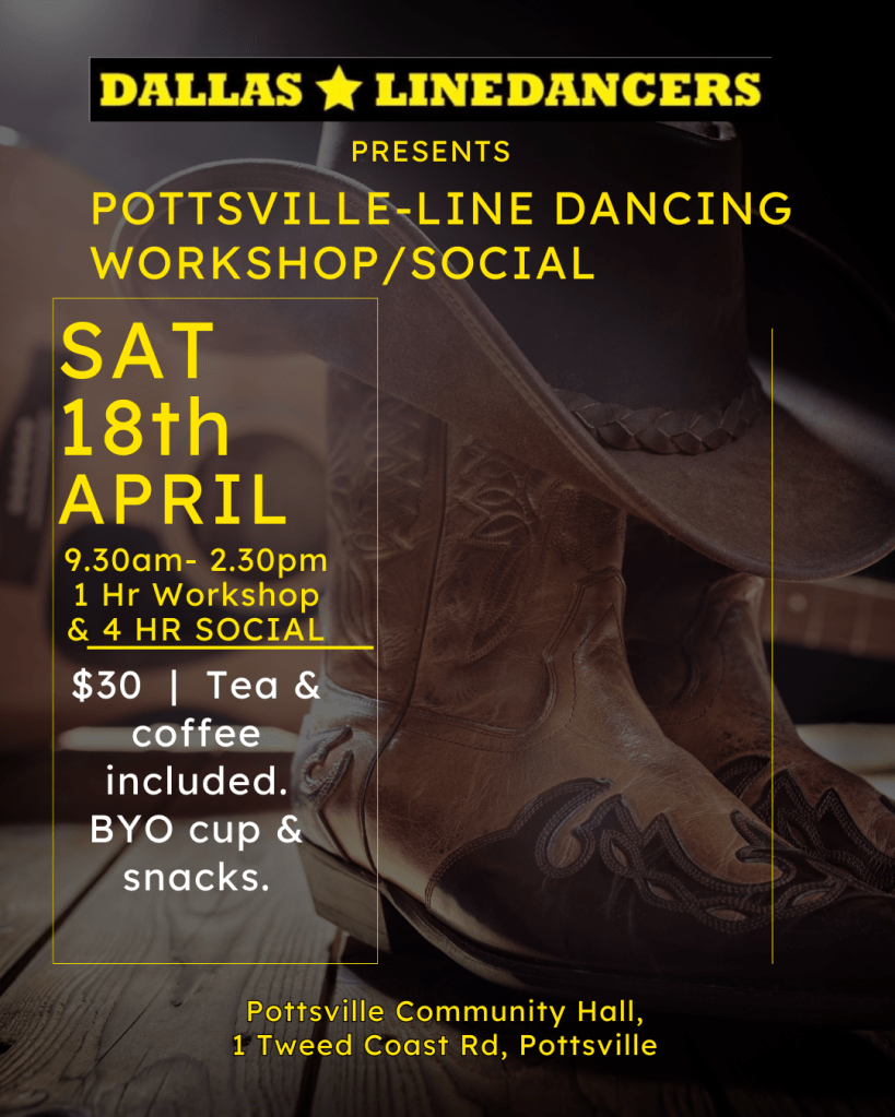 Pottsville LINE DANCE Anniversary Weekend – 18-19-20 JULY 2025! Also, a celebration of my 30 years of teaching line dancing. FRIDAY & SATURDAY SOCIALS July 18 and July 19 7PM –11.00PM – $20 EACH Spectators $10 All levels of dancing – Beginners, Improv, Early interm, interm/advanced. I split the floor (beginners and improvers get to dance 85% of the time). SATURDAY WORKSHOPS (July 18) 10-3PM – $30 Spectators $15 1 HR BREAK FOR LUNCH with social dancing and, there will be dancing in between teaching. Please bring own snacks/lunch/suppers – I will provide tea & coffee. BYO mug. CLASSIC REVISION DANCES TAUGHT (one each level). Theme Sat night social is “Neon/Fluoro”. All request night, but to “get in first” with your requests – email me 3 to use all weekend and Sat night. Breakie/brunch this year on the Sunday 20th 10am (my birthday brunch celebration) @2 Brothers cafe @1 Coronation Dve Pottsville.
